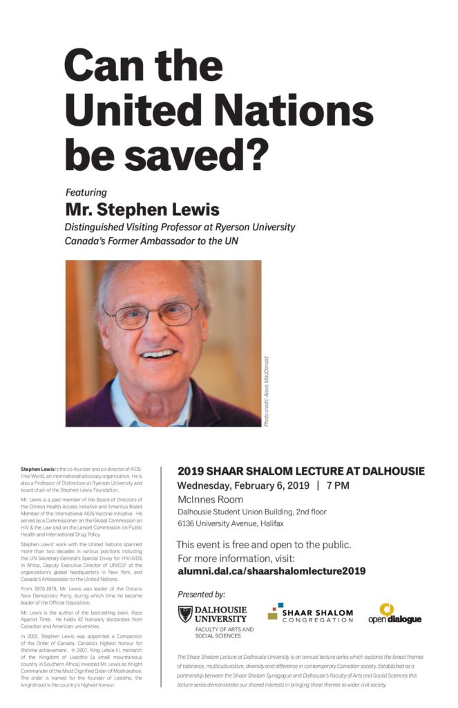 This year’s Shaar-Dal Lecture Series, Mr. Stephen Lewis, Canada’s former Ambassador to the United Nations will deliver a talk entitled, Can The United Nations Be Saved? It will take place on Wednesday February 6, 2019 at 7 pm, McInnes Room Dalhousie Student Union Building, 2nd floor 6136 University Avenue, Halifax.
