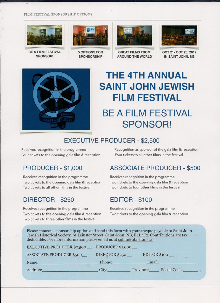 The Saint John Jewish Historical Museum is pleased to announce that it will be holding the Fourth Annual Saint John Jewish Film Festival from October 21 to October 26, 2017. The films to be shown have been featured in prestigious film festivals around the world. The proceeds from the film festival will support the work of the Saint John Jewish Historical Museum to preserve the Jewish history of Saint John.