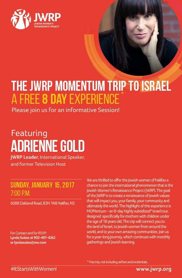 We are thrilled to offer the Jewish women of Atlantic Canada a chance to join the international phenomenon that is the Jewish Women’s Renaissance Project (JWRP). The goal of the JWRP is to create a renaissance of Jewish values that will impact you, your family, your community, and ultimately the world. The highlight of this experience is MOMentum – an 8-day highly subsidized* Israel tour, designed specifically for mothers with children under the age of 18 years old. The trip will connect you to the land of Israel, to Jewish women from around the world, and to your own amazing communities. Join us for a year-long journey, which continues with monthly gatherings and Jewish learning.