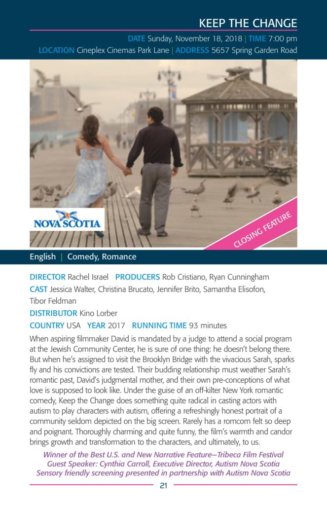 When aspiring filmmaker David is mandated by a judge to attend a social program at the Jewish Community Center, he is sure of one thing: he doesn’t belong there. But when he’s assigned to visit the Brooklyn Bridge with the vivacious Sarah, sparks fly and his convictions are tested. Their budding relationship must weather Sarah’s romantic past, David’s judgmental mother, and their own pre-conceptions of what love is supposed to look like. Under the guise of an off-kilter New York romantic comedy, Keep the Change does something quite radical in casting actors with autism to play characters with autism, offering a refreshingly honest portrait of a community seldom depicted on the big screen. Rarely has a romcom felt so deep and poignant. Thoroughly charming and quite funny, the film’s warmth and candor brings growth and transformation to the characters, and ultimately, to us. Winner of the Best U.S. and New Narrative Feature—Tribeca Film Festival Guest Speaker: Cynthia Carroll, Executive Director, Autism Nova Scotia Sensory friendly screening presented in partnership with Autism Nova Scotia