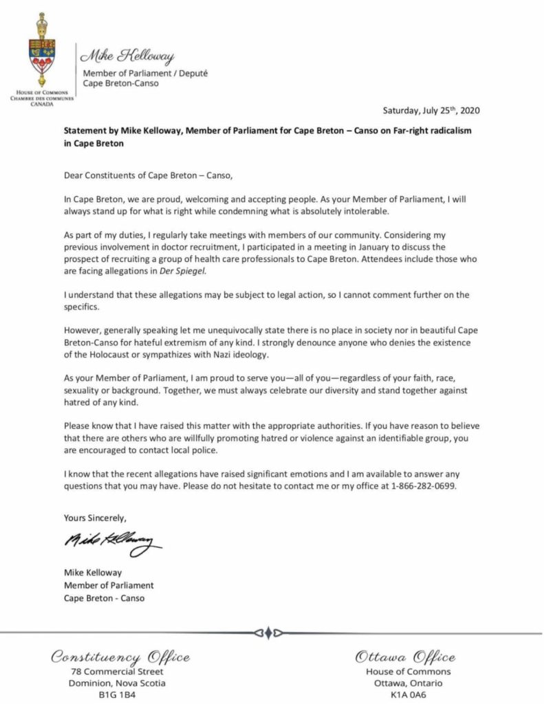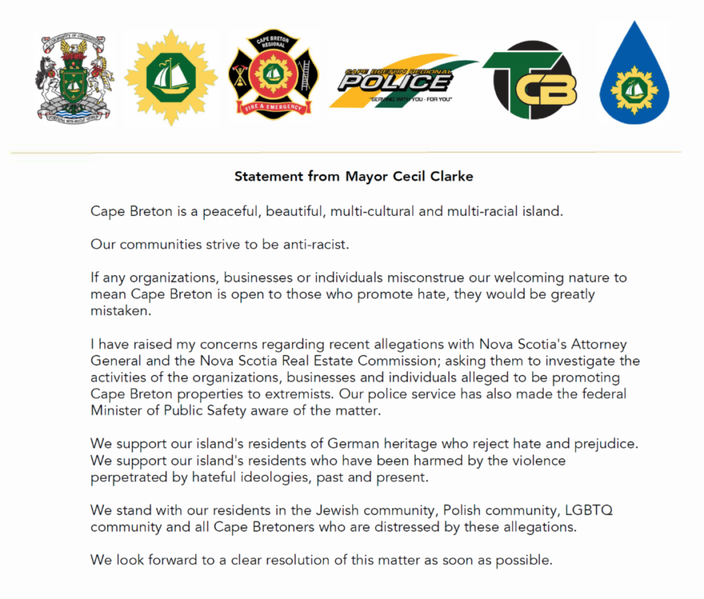 August 8th: In a previous newsletter, we let this community know that we were aware of the allegations in the German newspaper Der Spiegel, alleging that a network of German nationals are attempting to acquire land in Cape Breton with the purpose of establishing a colony of far right radicals and neo-Nazi ideologues. Since that time, there have been many reports about this allegation in newspapers across our region and across the country.
