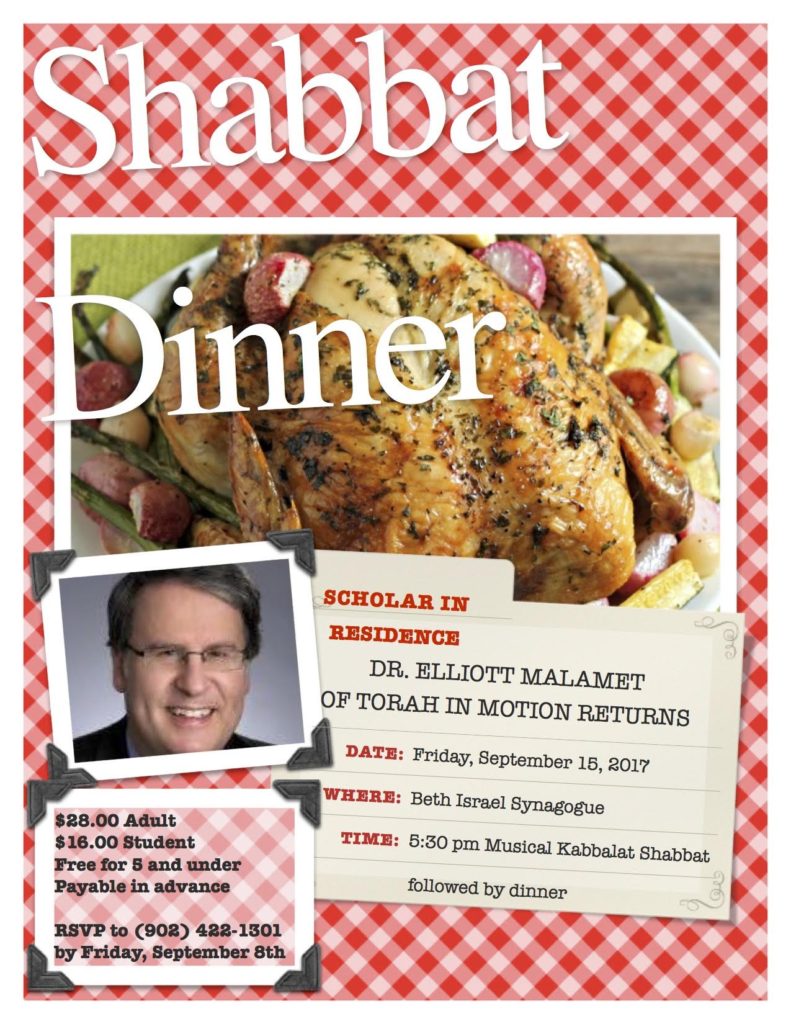 The Beth will once again be hosting Rabbi Elliott Malamet, as Scholar in Residence over the weekend of September 15/16. Please join us for a Shabbat Dinner on Friday, September 15th (catered by Sybil Fineberg) and Shabbat services on September 16th. See flyer below for dinner details.