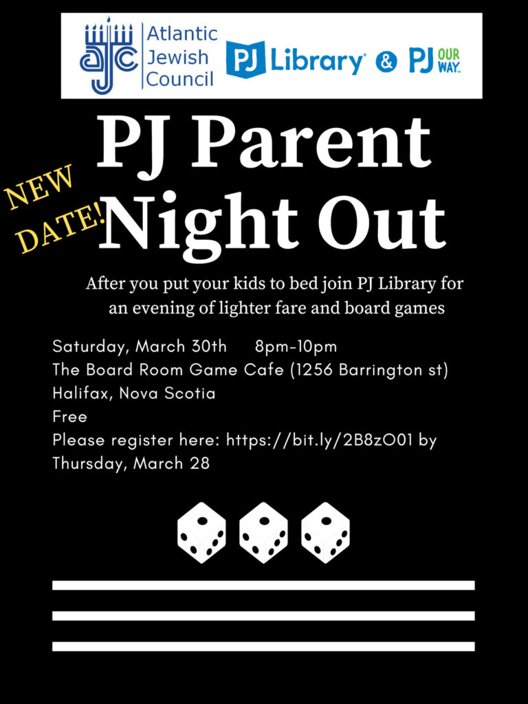 The Atlantic Jewish Council, PJ Library®, and PJ Our Way® invite you Parents Game Night. WHAT: After you put your kids to bed join PJ Library for an evening of noshing and games. The Board Room Game Cafe has over 500 games to choose from! WHO: All parents are welcome, but the program is geared…