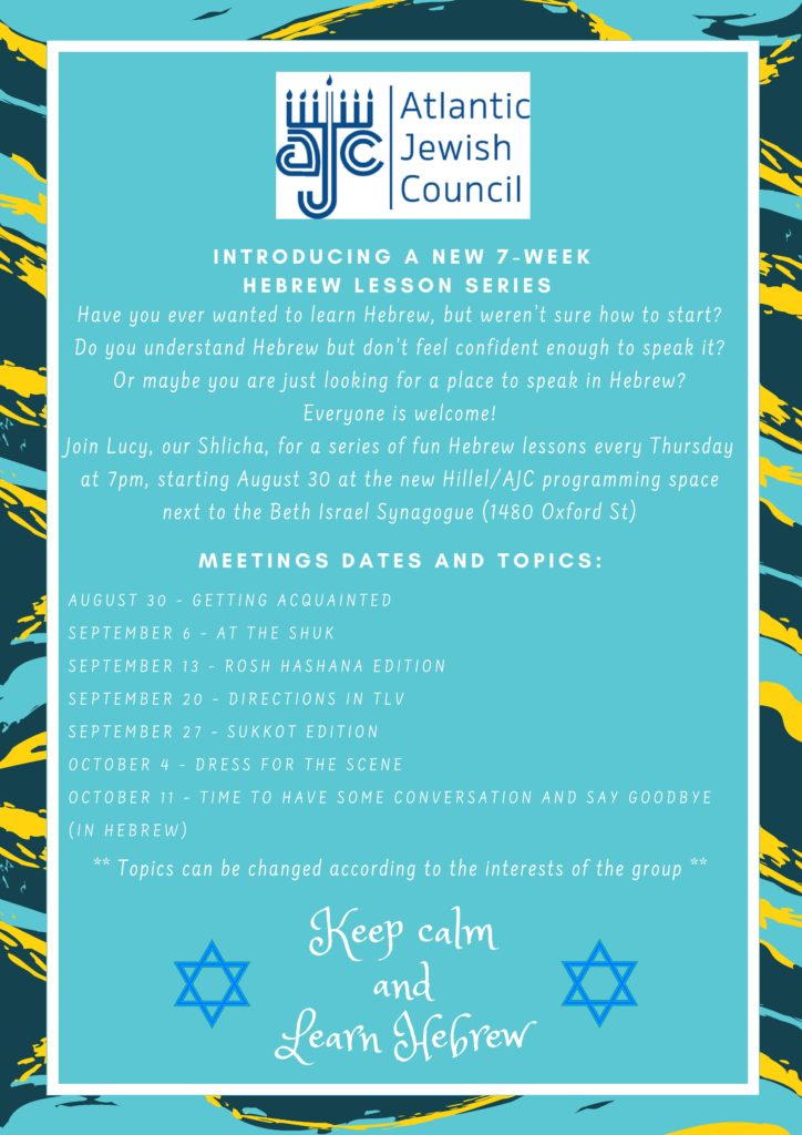 Come out for our first session to join our Shlicha, Lucy, on August 30th at 7 PM at the new Hillel/AJC programming space next to the Beth Israel Synagogue (1480 Oxford Street) for Hebrew lessons! Lessons will be every Thursday from August 30th until October 11th.