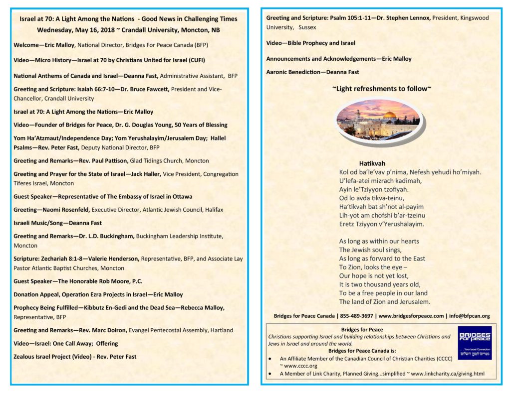 Israel at 70: A Light Among the Nations – Moncton, NB Good News in Challenging Times Date: Wednesday, May 16, 2018 Time: 7:00 pm (doors open at 6:30 pm) Location: Crandall University (Brinton Auditorium), 333 Gorge Rd, Moncton, NB Fundraising Event Reception to follow – Hors d’ Oeuvres & light refreshments RSVP by May 2, 2018 by clicking here or…