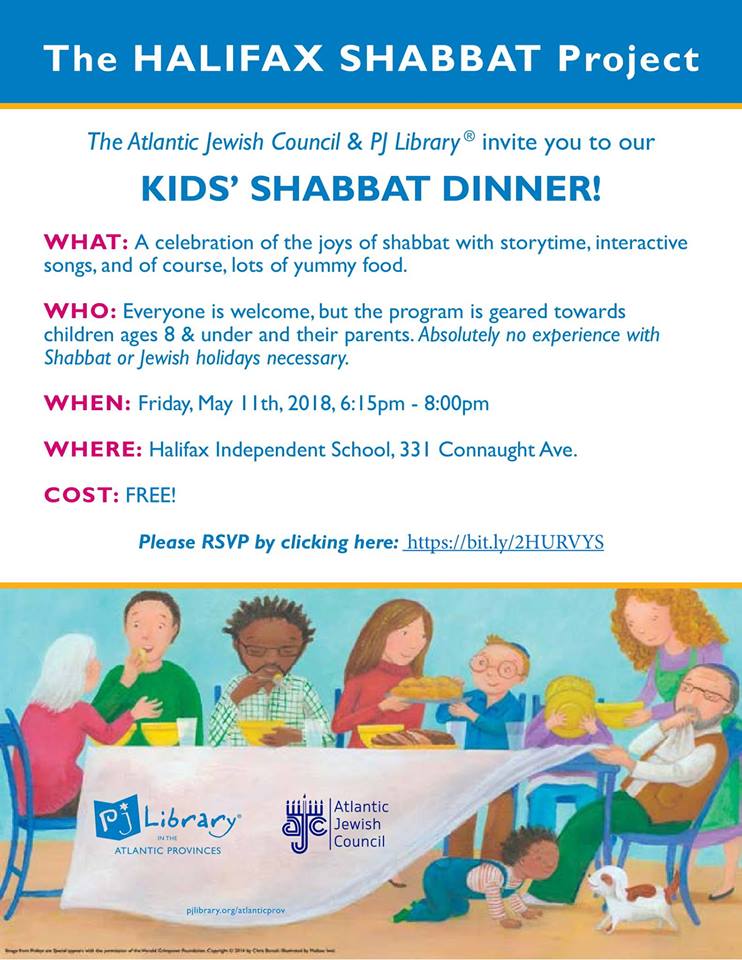 The Atlantic Jewish Council & PJ Library® invite you to our 5th event of the year… Kids Shabbat Dinner WHAT: Join PJ Library® for a kids Shabbat dinner featuring a story, interactive songs, and a delicious meal! WHO: All families are welcome, but the program is geared towards families with children ages 8 & under.…