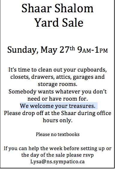 Sunday, May 27th, 9Am-1Pm It’s time to clean out your cupboards, closets, drawers, attics, garages and storage rooms. Somebody wants whatever you don’t need or have room for. We welcome your treasures. Please drop off at the Shaar during office hours only. Please no textbooks.