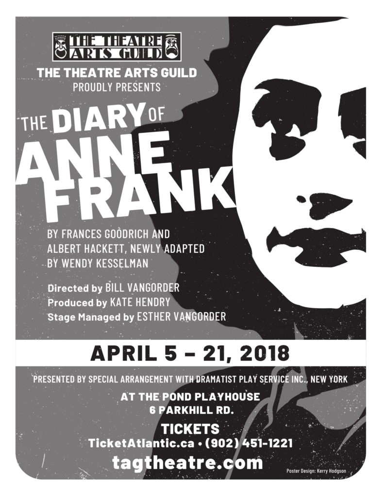 The theatre arts guild proudly presents The Diary of a nine frank by Frances Goodrich and Albert Hackett, newly adapted by Wendy Kesselman. Directed by Bill Vangorder, Produced by Kate Hendry , Stage managed by Esther Vangorder. April 5-21, 2018 Presented by special arrangement with dramatist play service inc.,New York at the Pond Playhouse 6…