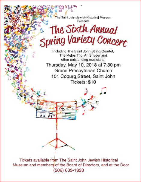Sixth Annual Spring Variety Concert Thursday, May 10, 2018, 7:30 p.m. Grace Presbyterian Church, 101 Coburg Street, Saint John in support of The Saint John Jewish Historical Museum Join us for an evening of musical performances by musicians and vocalists from the Saint John area. Performers include the Saint John String Quartet, the Melos…