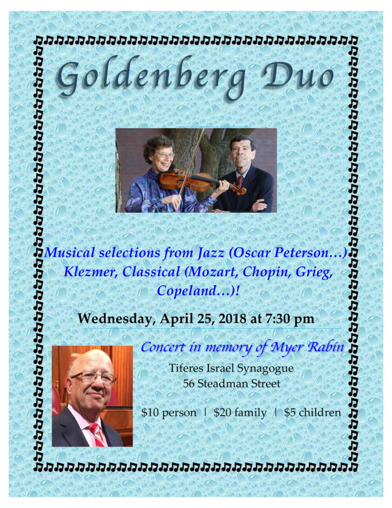 There will be a concert in the memory of Myer Rabin. A duo of musicians, Susan and William. Musical selections from Jazz, Klezmer, Classical. The concert will be on Wednesday April 25, 2018 at 7.30pm in Tiferes Israel Synagogue, 56 Steadman Street The ticket prices are $10 person, $20 family and $5 children.