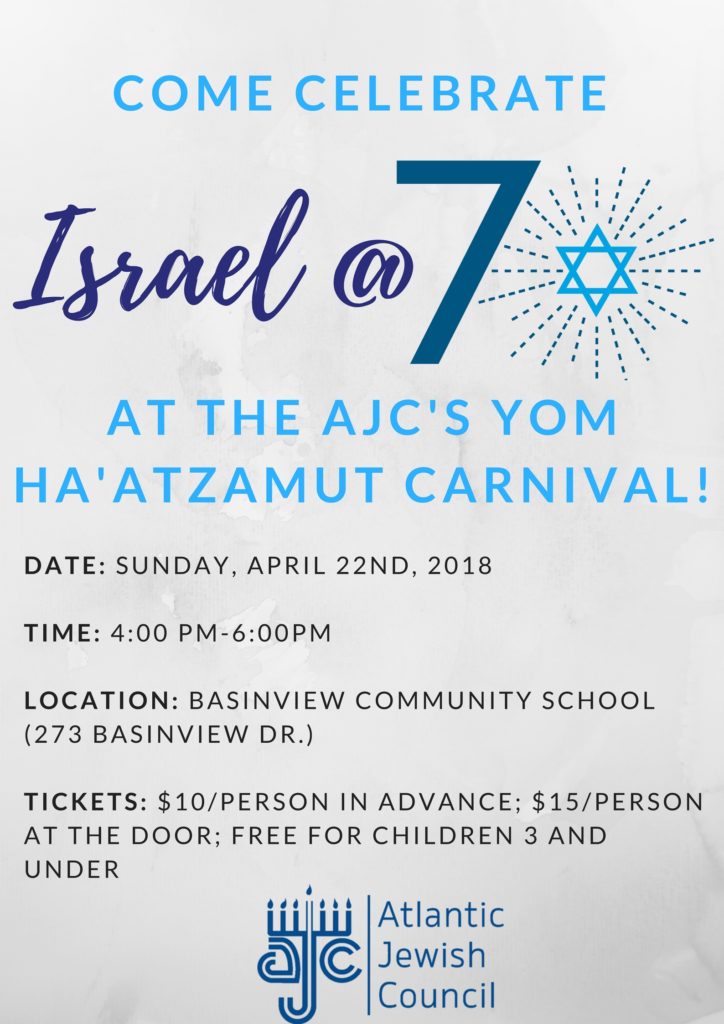 Come celebrate Israel@70 at the AJC’s fun-filled family-friendly Yom Ha’atzamut Carnival. Date: Sunday, April 22nd, 2018 Time: 4:00pm-6:00pm Location: Basinview Community School (273 Basinview Dr., Bedford Tickets: $15/person at the door; FREE for children 3 & Under Admission includes access to all carnival games/activities, dinner, and dessert. The deadline for purchasing advance tickets has passed. If…