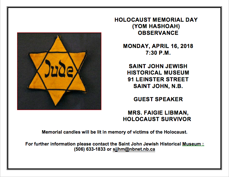 SAINT JOHN JEWISH HISTORICAL MUSEUM 91 LEINSTER STREET, SAINT JOHN, N.B. E2L 1J2 TEL: (506) 633-1833; EMAIL : SJJHM@NBNET.NB.CA HOLOCAUST MEMORIAL DAY OBSERVANCE (YOM HASHOAH) MONDAY, APRIL 16, 2018; 7:30 P.M. SHAAREI ZEDEK SYNAGOGUE 91 LEINSTER STREET, SAINT JOHN, N.B. The programme will feature a keynote address by Mrs. Faigie Libman. She was…