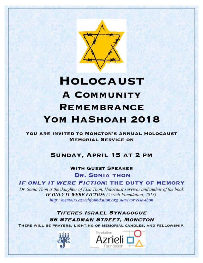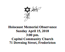 “Holocaust: A Community Remembrance – Yom HaShoah 2018”, Moncton’s annual Holocaust Memorial service will be on Sunday, April 15th, at 2pm. With guest speaker Dr. Sonia Thon. Tiferes Israel Synagogue, 56 Steadman Street, Moncton. There will be prayers, lighting of memorial candles, and fellowship.