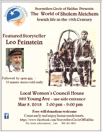 Storytellers Circle of Halifax Presents The World of Sholem Aleichem: Jewish life in the 19th Century with featured Storyteller: Leo Feinstein. Followed by open mic- 10 minute stories told orally at Local Women’s Council House 989 Young Ave- use side entrance March 8, 2018 7pm-9pm. Free-will donations welcome. Come early and enjoy home-made treats. https://www.facebook.com/StorytellersCircleOfHalifax For more…