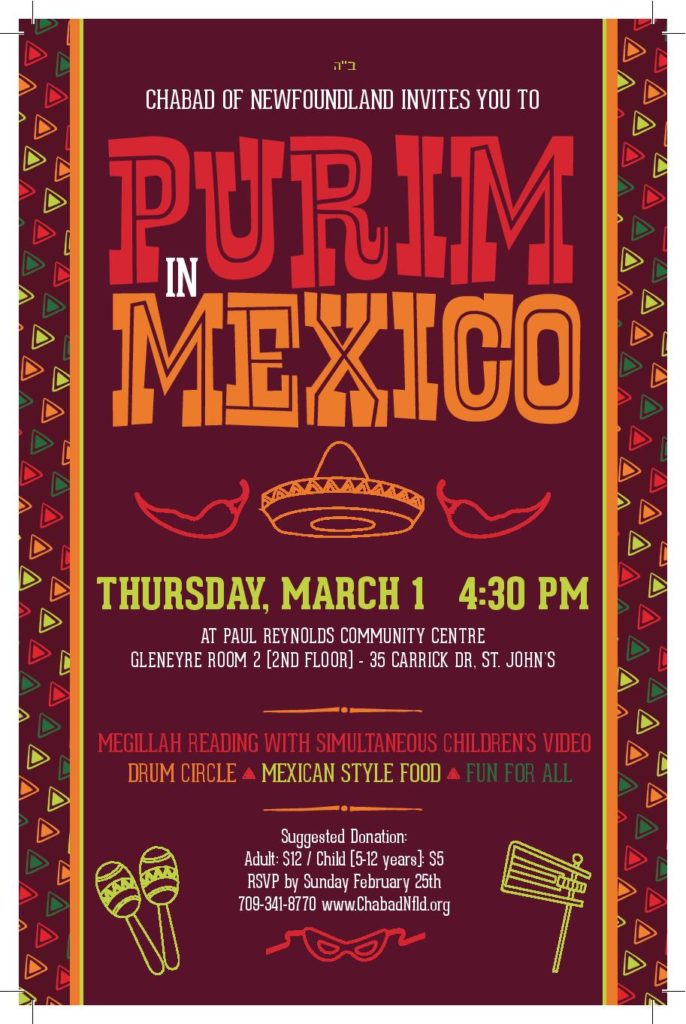 Chabad Of Newfoundland invites you to PURIM IN MEXICO Thursday, March 1 – 4:30 PM At Paul Reynolds Community Centre- Gleneyre Room 2 (2nd Floor) – 35 Carrick Dr. Saint John’s Megillah reading with simultaneous children’s video, Drum Circle, Mexican Style Food, Fun for all Suggested donation: Adult : $12 / Child (5-12 years):…