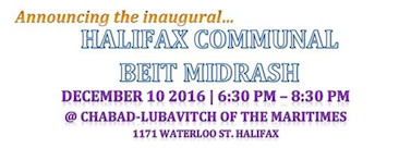 December 10 2016 | 6:30 PM – 8:30 PM @Chabad-Lubavitch of the Maritimes (1171 Waterloo St., Halifax). Beit Midrash means “House of Study.” Join us… for an evening of Torah for all ages for all Jews for all backgrounds for all of Halifax!