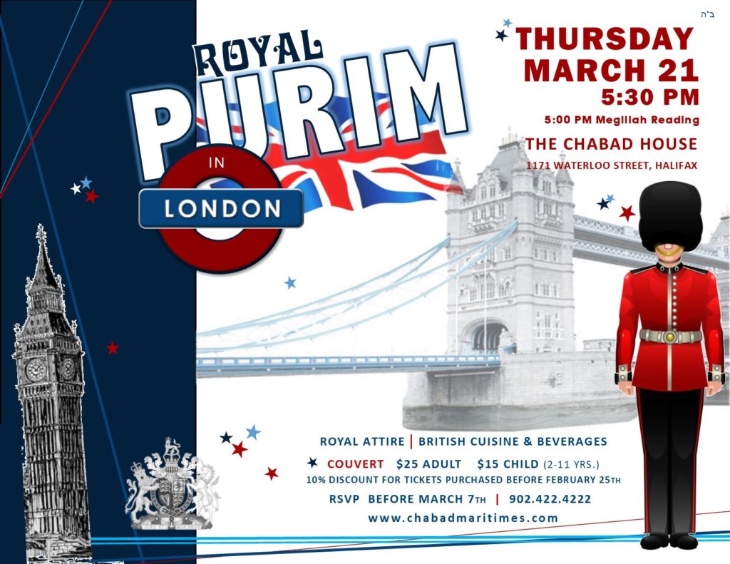 Please join the Chabad of the Maritimes for a Royal Purim Celebration at the The Chabad House. When: Thursday March 21, 5:30 PM Where: The Chabad House (1171 Waterloo Street, Halifax) Royal Attire Cost: $25 Adult $15 Child (2-11 yrs old.) RSVP: Before March 7th 902-422-4222 or www.chabadmartimes.com