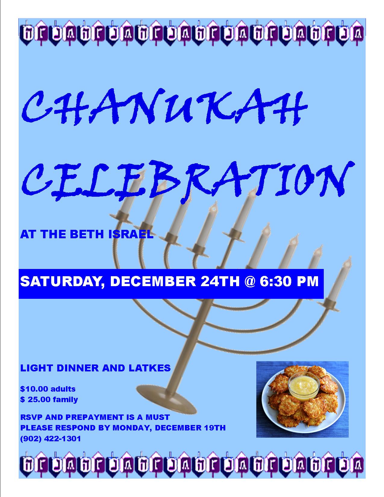 Chanukah Celebration at the Beth Israel Chanukah Celebration at the Beth Israel: Saturday, December 24th @6:30pm. Light Dinner and Latkes. $10.00 Adults. $25.00 Family. RSVP AND PREPAYMENT IS A MUST. Please respond by Monday, December 19th. (902) 422-1301 Posted in General News