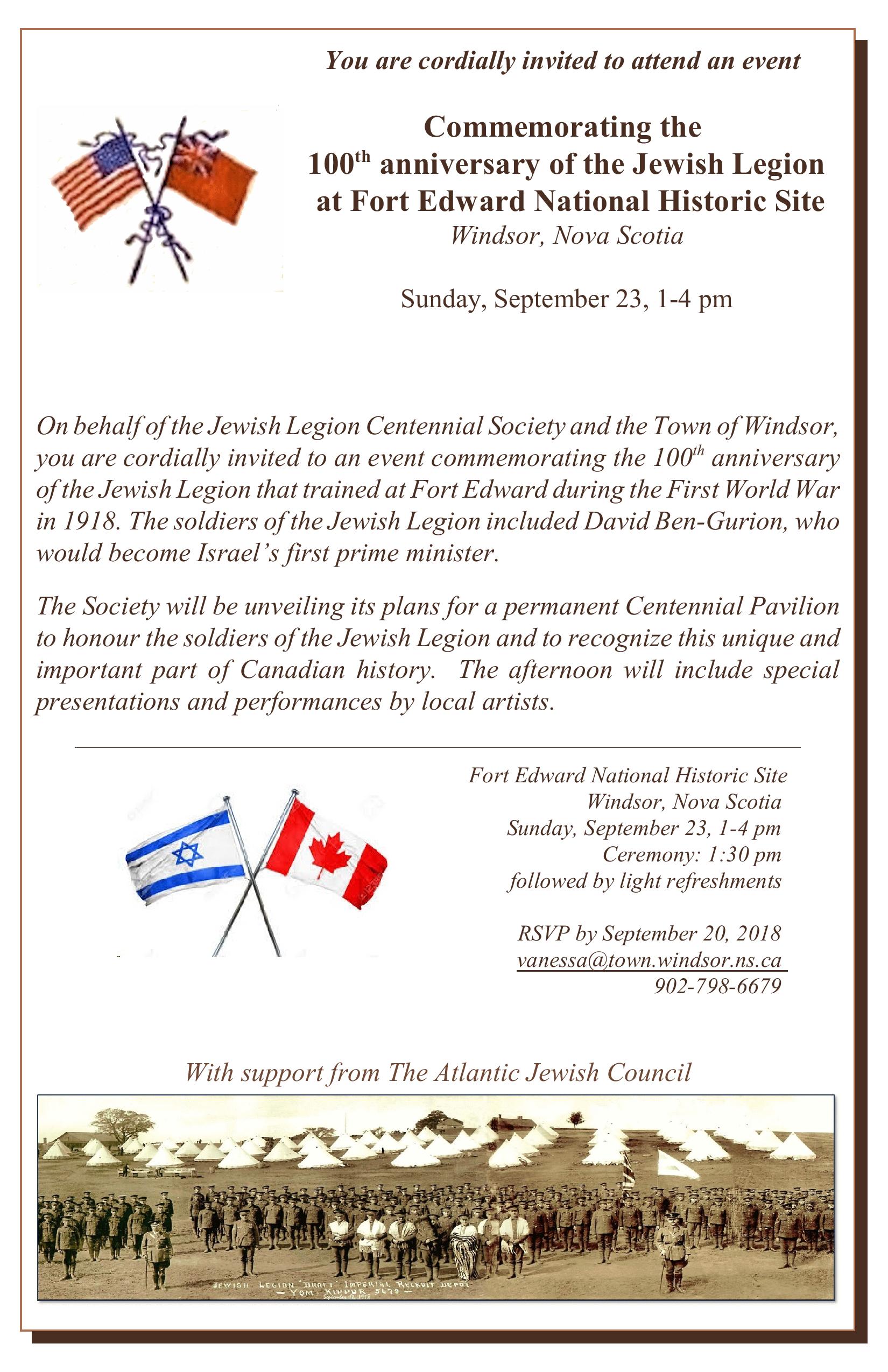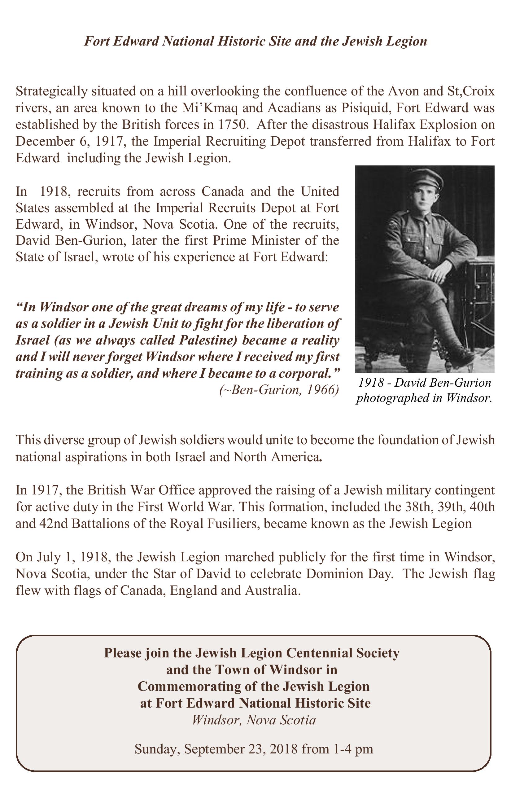 Please join the Jewish Legion Centennial Society and the Town of Windsor in commemorating the 100th Anniversary of the Jewish Legion at Ford Edward National Historic Site in Windsor, Nova Scotia on Sept 23, 2018, from 1-4PM.
