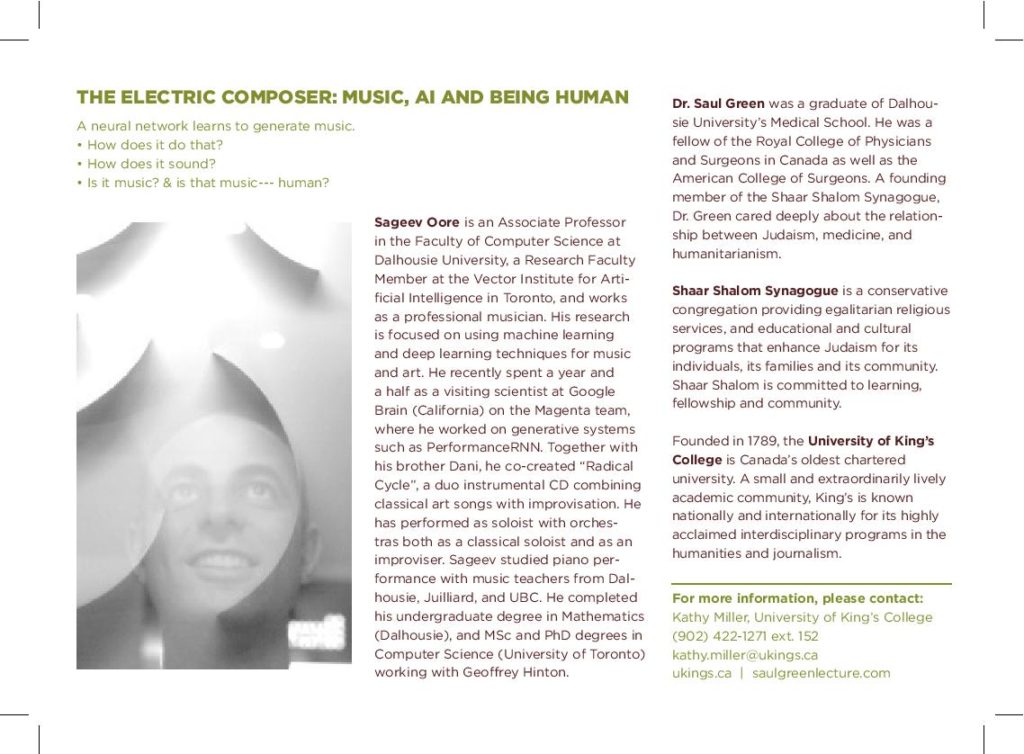 As detailed on the lecture postcard, this year’s lecture will be presented by Dr. Sageev Oore a professor in the Faculty of Computer Science at Dalhousie University and Visiting Faculty Research Scientist, Google Brain, Google Research (2016-2018). Dr. Oore’s lecture title is: The Electric Composer: Music, AI and being human. He will include aspects of music that are connected to being human and will talk about neural networks learning to generate music and address questions such as: