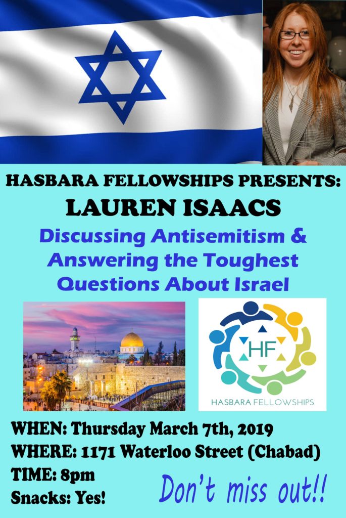 Lauren Isaacs of the the Hasbara Fellowship is hosting a discussion on Antisemitism & Answering the toughest Questions about Israel.