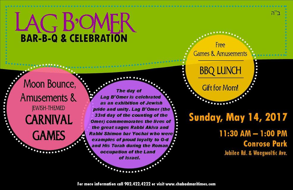 LAG B’OMER BAR-B-Q & CELEBRATION Sunday, May 14th, 11:30-1:00 pm, Conrose Park (Jubilee Rd & Waegwoltic Ave.)
