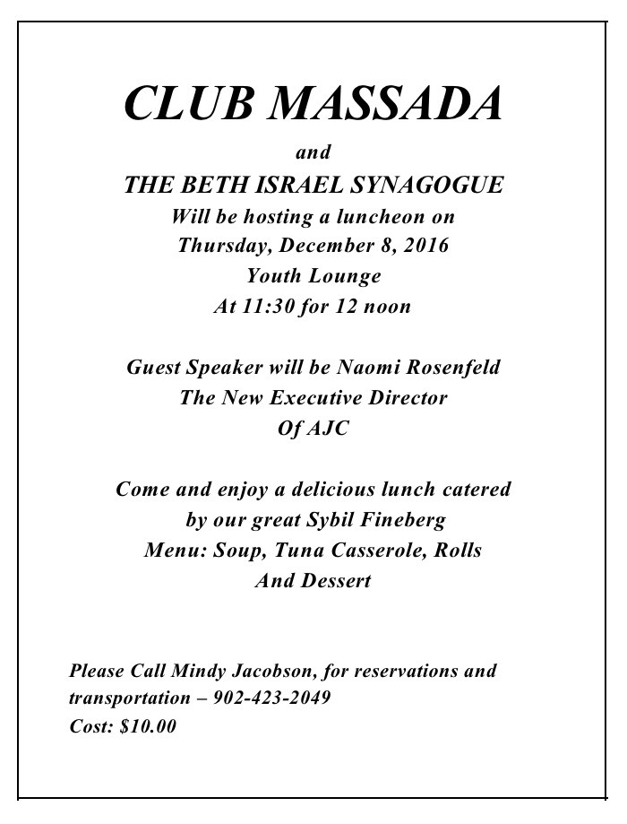 Massada Club Luncheon Massada will be holding their next luncheon at the Beth Israel at noon on Thursday, December 8th. Admission is $10 per person. Posted in General News