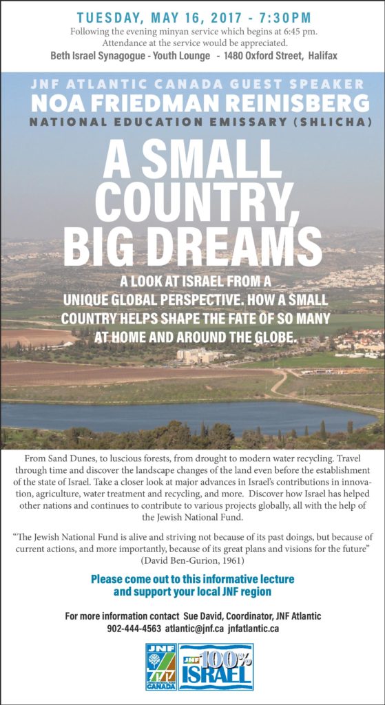 JNF Hosts Talk by Noa Friedman Reinsberg Tuesday, May 16th, 2017 – 7:30 pm Following the evening minyan service which begins at 6:45 pm. Attendance at the service would be appreciated. Beth Israel Synagogue – Youth Lounge – 1480 Oxford Street, Halifax Posted in General News