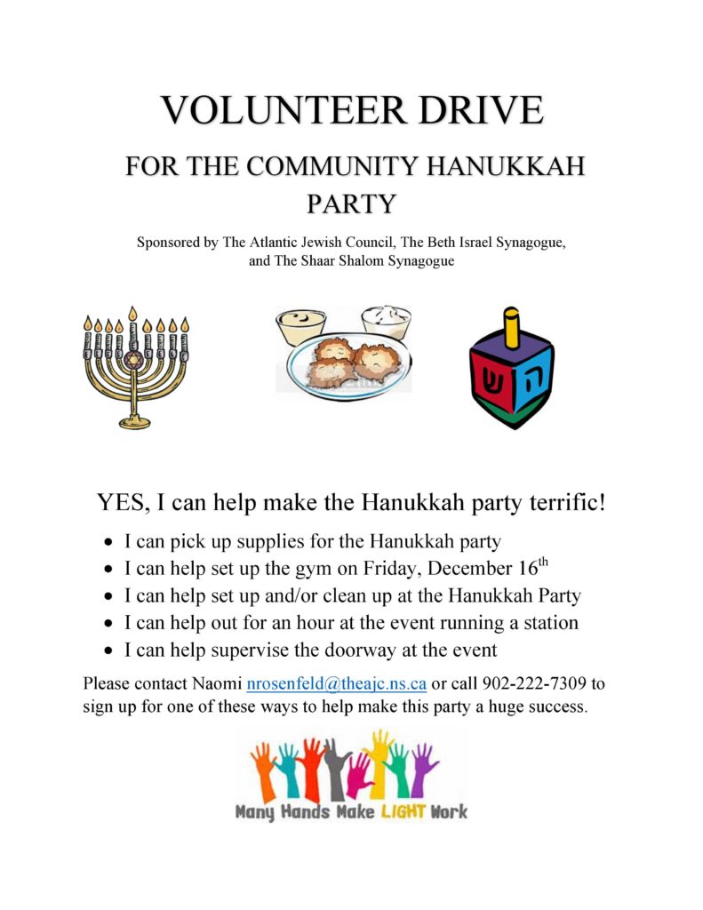 Want to help the Halifax Jewish community celebrate Channukah? We need volunteers for all of the following times: