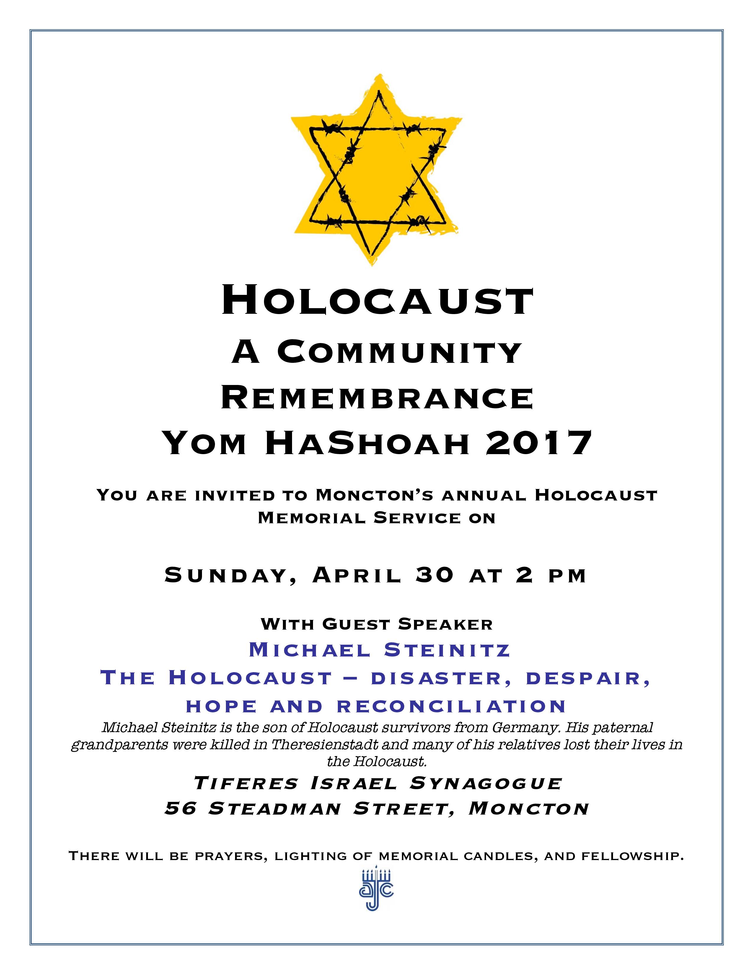 Yom Hashoah 2017 in Moncton Everyone is invited to Moncton’s Annual Holocaust Memorial Service on Sunday April 30th, at 2pm, with Guest Speaker Michael Steinitz. Posted in General News